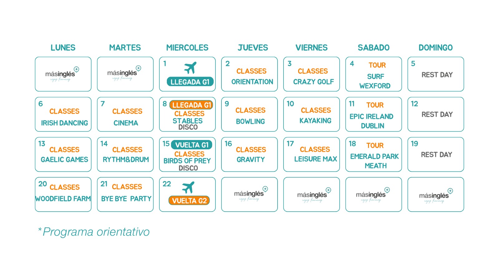 El grupo estará acompañado de monitores de Masinglés y coordinadores irlandeses para poder asistir a nuestros alumnos en todo lo que necesiten.